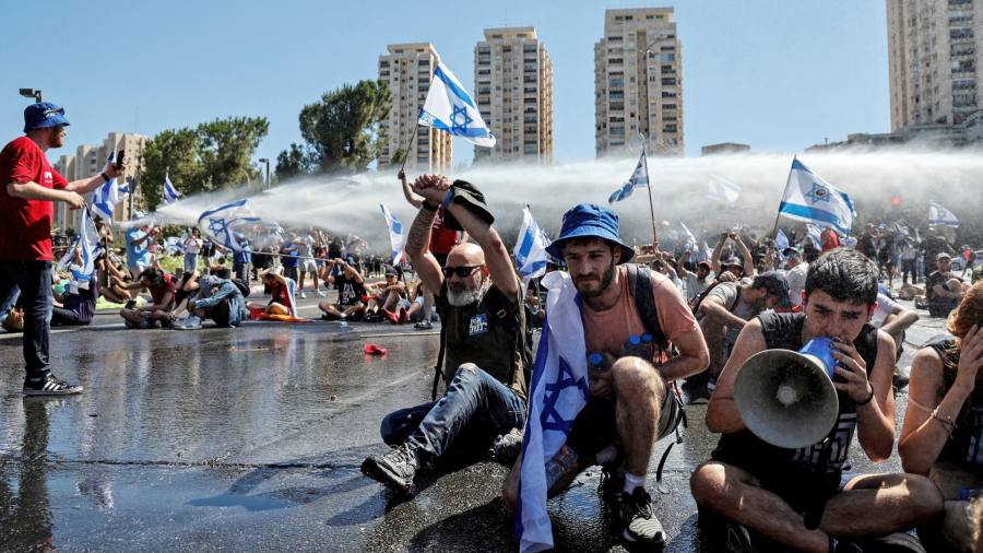 The battle over the changes has sparked one of the most sustained waves of protests in Israel’s modern history, with hundreds of thousands of people taking to the streets week after week to demonstrate against the plans. Renewed protests swept across the country on Monday evening, with police using water cannons to disperse protesters in Jerusalem and Tel Aviv.