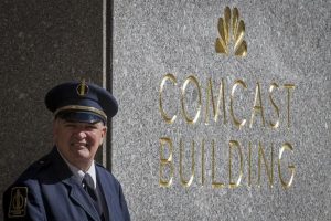 © Reuters. FILE PHOTO: Small toy figures with laptops and smartphones are seen in front of displayed Comcast logo, in…