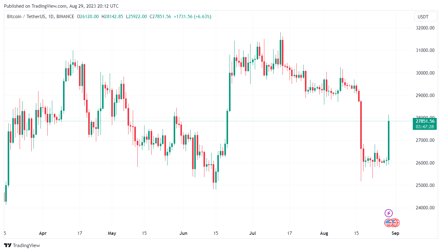 Today, Bitcoin prices finally surged by 7%, currently trading at $27,851 as of writing following Grayscale’s lawsuit victory against the SEC.