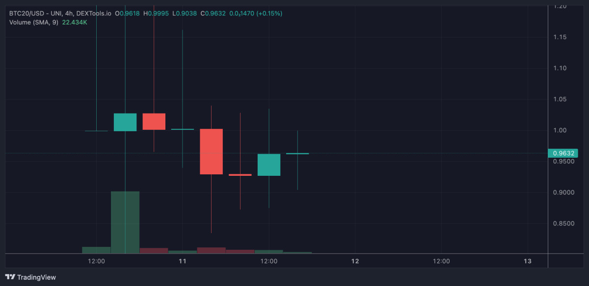 The BTC20 price is trading at around $0.94, according to data on DEXTools.