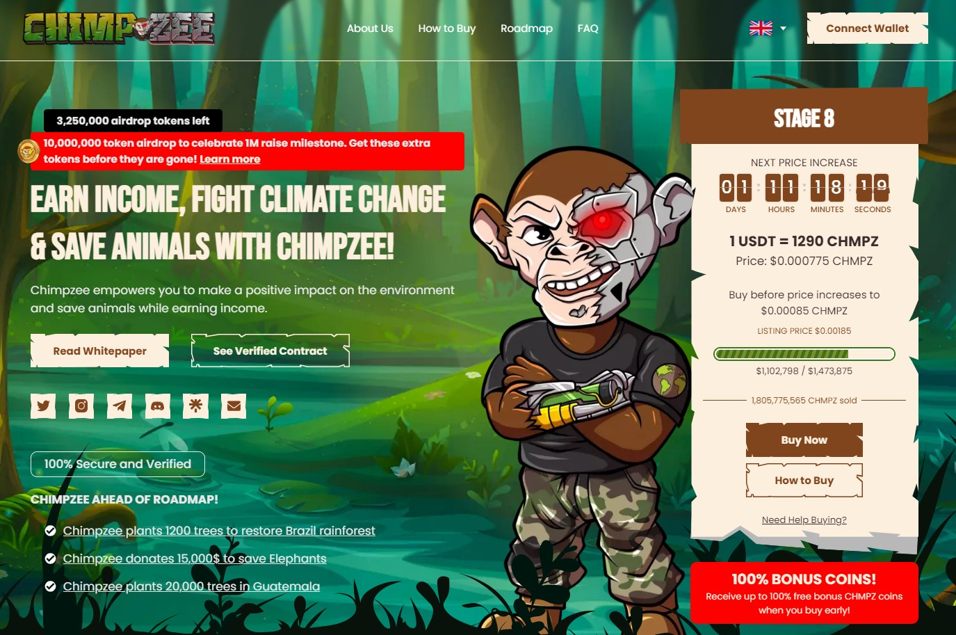 As per Chimpzee’s website, these tokens will be airdropped to your wallet after the presale claim is launched. That comes on top of a 100% token bonus that Chimpzee is already offering to presale participants.