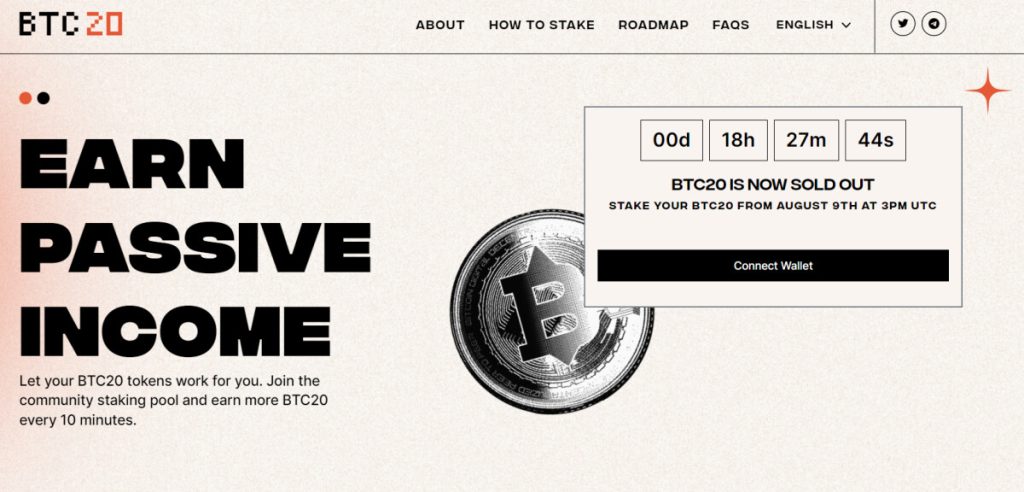 For those who managed to get in on the BTC20 presale, staking will become available on the 9th of August at 1500 UTC.
