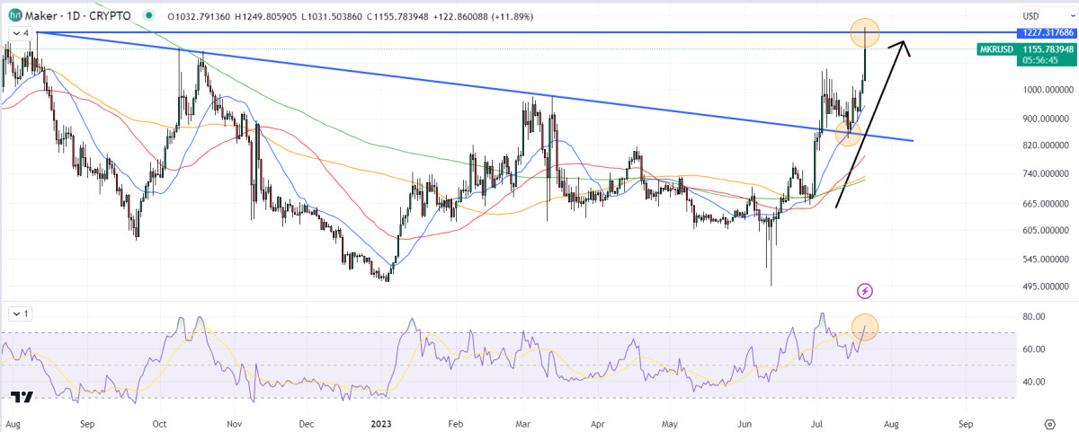 MKR/USD was last trading around $1140 per token, but went as high as $1250 earlier in the session to hit a fresh high since June 2022.