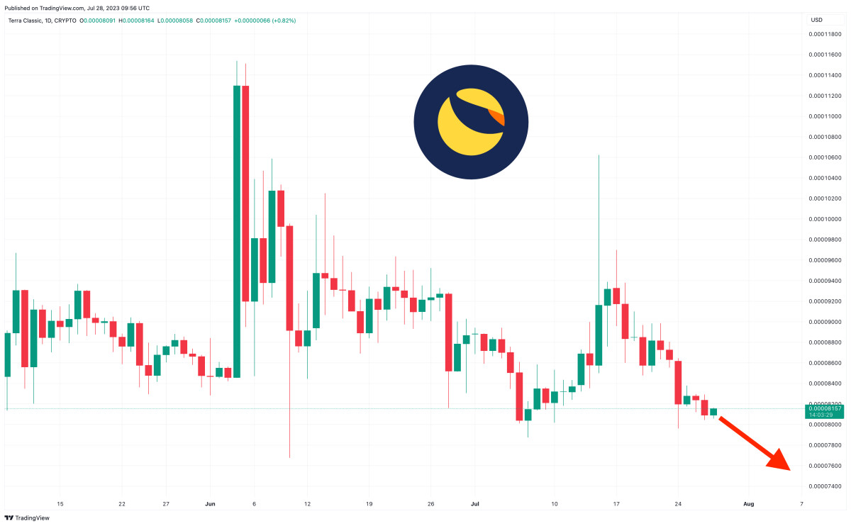 Indeed, LUNC truly does seem like a cryptocurrency caught in the throes of a terminal decline, with there being the possibility of a drop to $0.000070 if it dives through the $0.000080 support level.