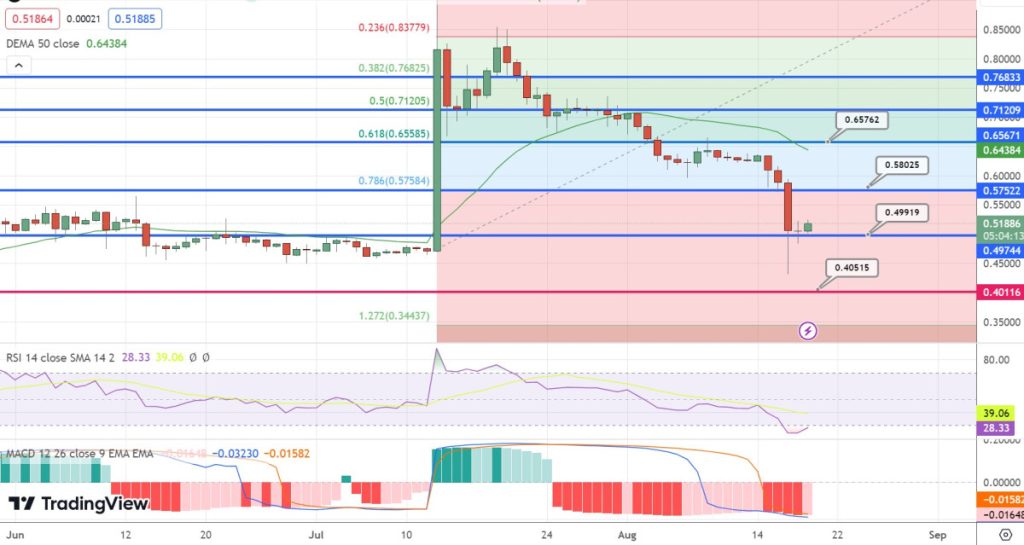 Currently priced at $0.50, stability has been found which may indicate the market is stabilizing after a drop.