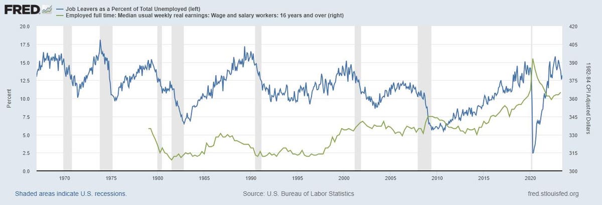 Based on the jump in the voluntary job leaver share, real wages may still increase. The correlation between real weekly earnings and the job leaver share is pretty tight — they move together (except after Covid when prices quickly outpaced wages for two terrible years, March 2020 – May 2022 prices).