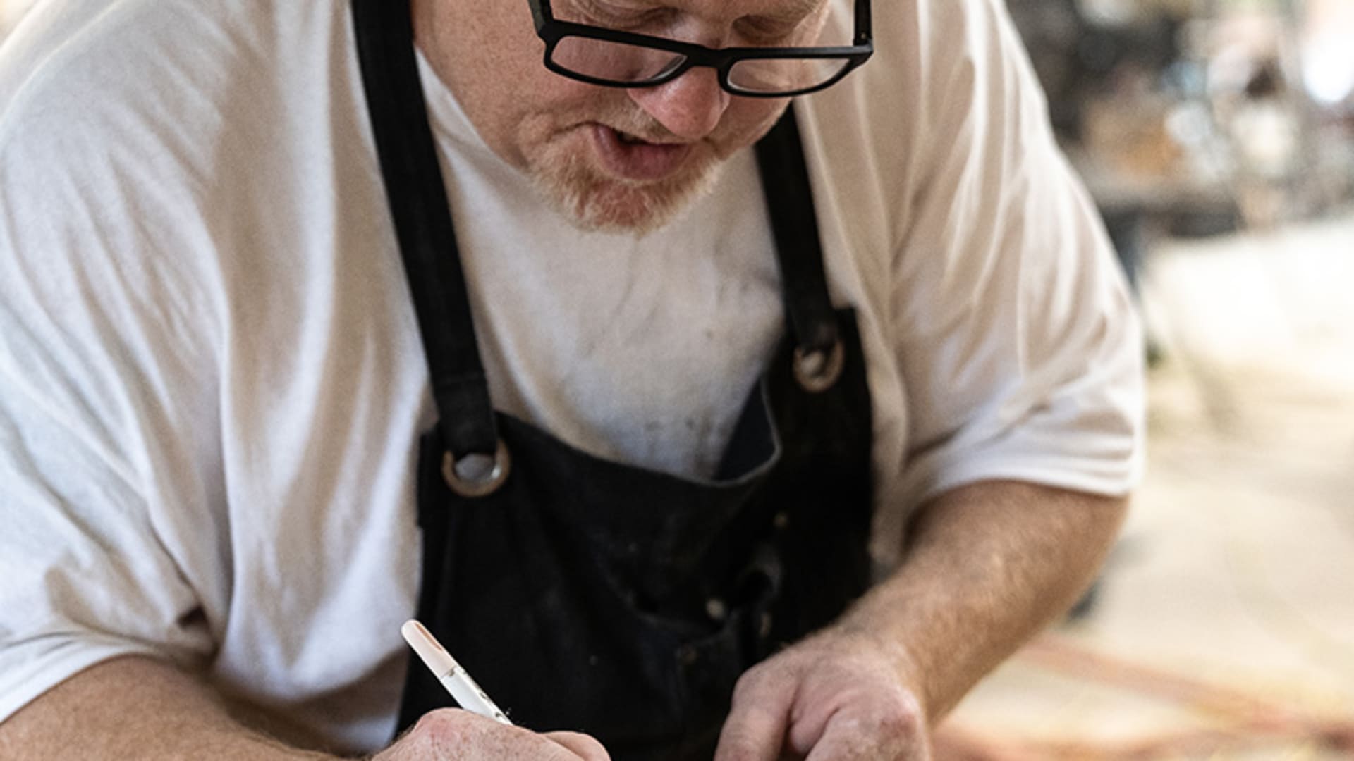 Now, Kristen has taken over a lot. She keeps me in line on what needs to be done. I’ll go out [to the workshop] and there’ll be a sticky note that says, “Dad, you need to pour seven beige stones today.”